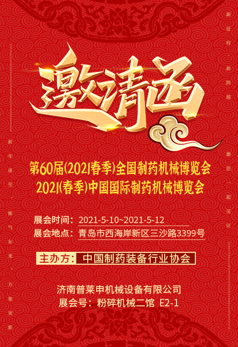 濟(jì)南普萊申機(jī)械設(shè)備有限公司成功申報(bào)第60屆2021年(春季)中國制藥機(jī)械博覽會(CIPM ),青島制藥機(jī)械展,CIPM將于2021年5月10日至5月12日在青島世界博覽城舉行