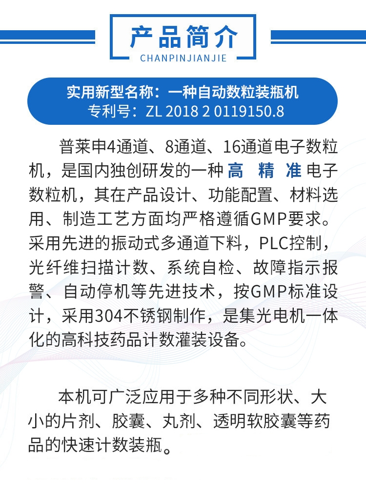 本機可廣泛應用于多種不同形狀、大小的片劑、膠囊、丸劑、透明軟膠囊等藥品的快速計數裝瓶,計數裝瓶精度達到國內外同類產品先進水平。