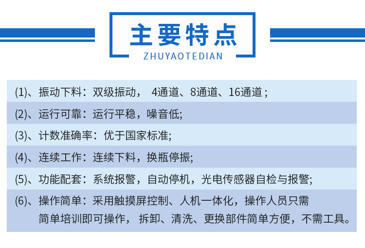 (5)、計數速度:20-30瓶/分(視劑型、瓶子規格、裝量及放瓶速度而定)。